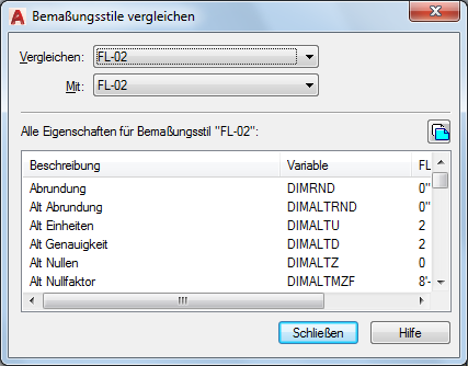 Vergleicht die Eigenschaften von zwei Bemaßungsstilen oder zeigt alle Eigenschaften eines einzelnen Stils an.