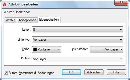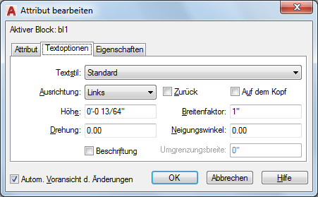 Bestimmt die Eigenschaften, die festlegen, wie ein Attributtext in der Zeichnung angezeigt wird. Die Farbe des Attributtextes können Sie auf der Registerkarte Eigenschaften ändern.