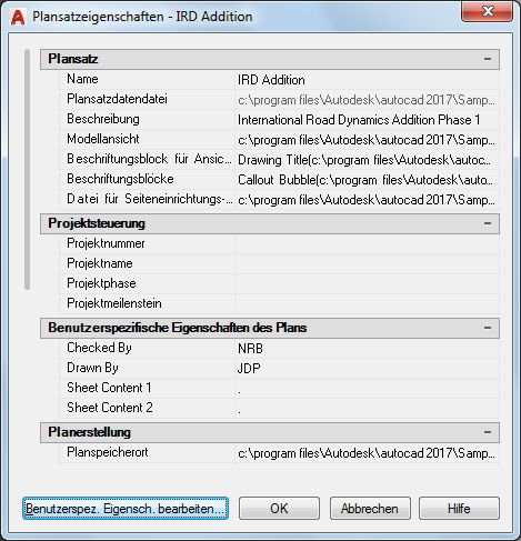Zu diesen Informationen gehören Pfad und Dateiname der DST-Datei (Plansatzdaten), die Pfade zu den Ordnern, in denen die Zeichnungsdateien der Plansätze abgelegt sind und alle mit dem Plansatz verbundenen benutzerspezifischen Eigenschaften