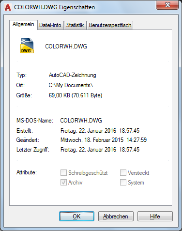 Zeigt den MS-DOS-Namen der Zeichnungsdatei, Datum der Erstellung sowie Datum und Uhrzeit der letzten Änderung und des letzten Zugriffs.