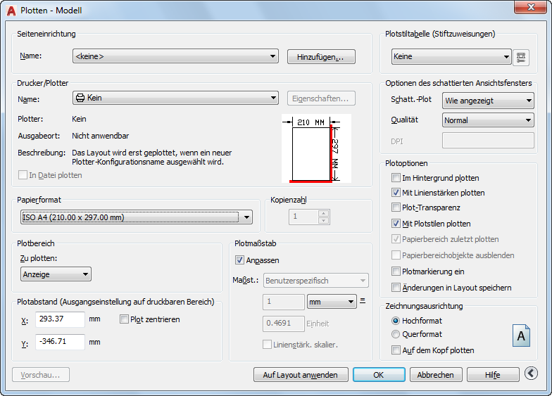 Zur Festlegung der Einstellungen für Gerät und Ausgabemedium sowie zum Plotten der Zeichnung.