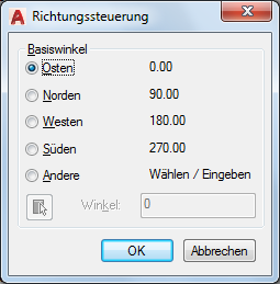 Legt die Richtung des Nullwinkels fest. Diese folgenden Optionen beeinflussen die Eingabe von Winkeln, das Anzeigeformat sowie die Eingabe von Polar-, Zylinder- und Kugelkoordinaten.