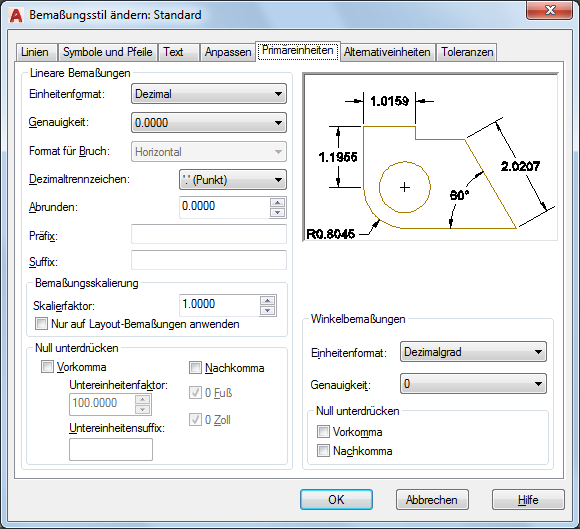 Legt das Format und die Genauigkeit der primären Bemaßungseinheiten fest und bestimmt die Präfixe und Suffixe für den Maßtext.
