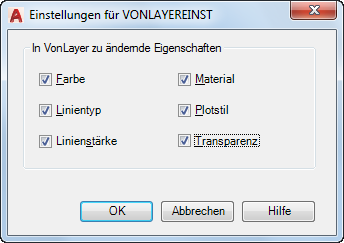 Ändert die Eigenschaftenüberschreibungen von ausgewählten Objekten und eingefügten Blöcken auf ungesperrten Layern für Farbe, Linientyp, Linienstärke, Material, Plotstil und Transparenz in VonLayer.