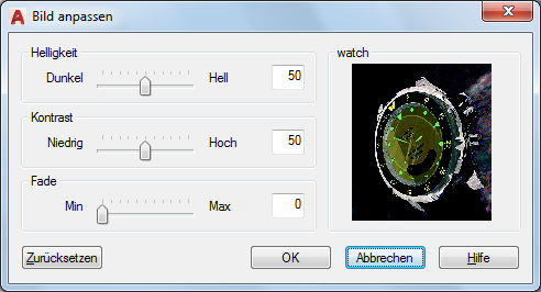 Regelt den Ausblendeffekt des Bildes. Je größer der Wert ist, desto mehr wird das Bild mit der aktuellen Hintergrundfarbe überblendet. Ein Wert von 100 lässt das Bild vollständig im Hintergrund verschwinden. Ein Verändern der Hintergrundfarbe des Bildschirms führt dazu, dass das Bild die neue Farbe annimmt. Beim Plotten ist Weiß die Hintergrundfarbe für Fade.
