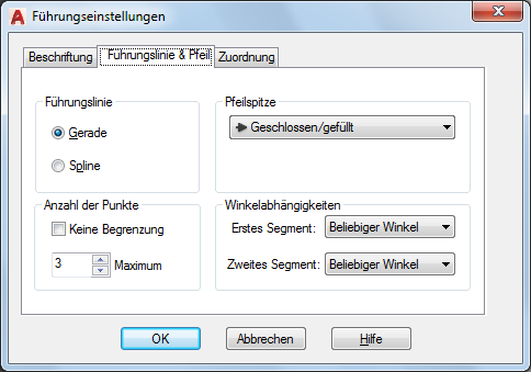 Legt die Anzahl der Führungspunkte fest, die mit dem Befehl SFÜHRUNG abgefragt werden, bevor der Führungsmaßtext angefordert wird. Wenn Sie beispielsweise den Wert 3 festlegen, fordert der Befehl SFÜHRUNG Sie nach Angabe von zwei Führungspunkten auf, den gewünschten Maßtext einzugeben. Die Anzahl der Punkte entspricht der Anzahl der zu erstellenden Führungsliniensegmente plus 1.