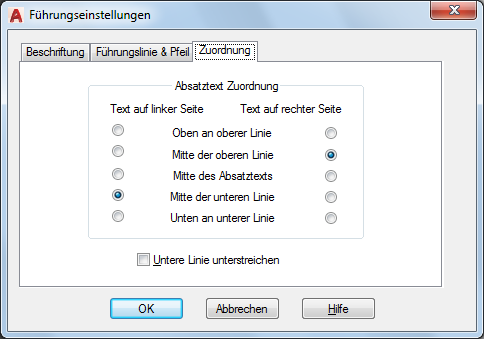 Bestimmt den Punkt, an dem die Führungslinien mit einem mehrzeiligen Maßtext verbunden werden sollen. Diese Registerkarte steht nur zur Verfügung, wenn Sie auf der Registerkarte Maßtext den Maßtexttyp MText ausgewählt haben.