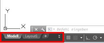 Anmerkung: Sie können zwischen verschiedenen Layouts und der Registerkarte Modell wechseln, indem Sie auf eine Registerkarte unten im Zeichenbereich klicken. Die Registerkarten Layout und Modell werden nur angezeigt, wenn Sie auf der Registerkarte Anzeige (Dialogfeld Optionen) die Option Registerkarten Layout und Modell anzeigen ausgewählt haben.