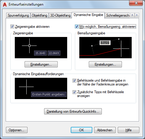 Steuert die Zeigereingabe, die Bemaßungseingabe, die dynamische Eingabeaufforderung und die Anzeige von QuickInfos der Zeichnungen.