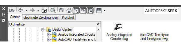 Die Strukturansicht im linken Bereich des DesignCenter-Fensters und die Registerkarten erleichtern das Suchen und Laden von Inhalt in den Inhaltsbereich.