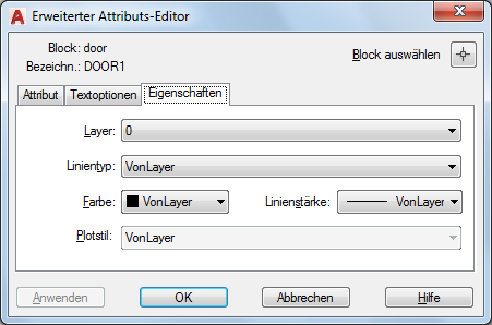 Definiert den Layer, auf dem sich das Attribut befindet, sowie die Linienstärke, den Linientyp und die Farbe für den Attributtext. Wenn die Zeichnung Plotstile verwendet, können Sie dem Attribut auf der Registerkarte Eigenschaften einen Plotstil zuweisen.