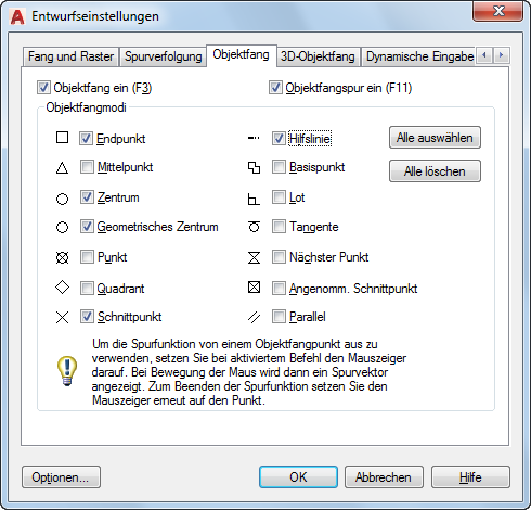 Steuert, ob alle angegebenen Objektfangmodi aktiviert oder deaktiviert sind. (Systemvariable OSMODE)