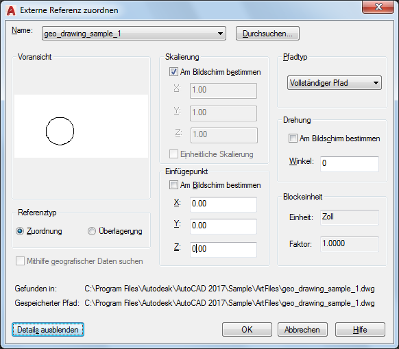 Wählen Sie den vollen (absoluten) Pfad, den relativen Pfad zur Datei der externen Referenz oder Kein Pfad sowie den Namen der Bilddatei aus (die Bilddatei muss sich in demselben Ordner wie die aktuelle Zeichnungsdatei befinden).