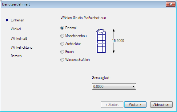 Der Assistent Benutzerdefiniert verfügt über fünf Seiten: Einheiten, Winkel, Winkelmaß, Winkelrichtung und Bereich. Mit den Optionen Zurück und Weiter wechseln Sie zwischen den einzelnen Seiten, mit Fertig stellen auf der letzten Seite schließen Sie den Assistenten und lassen die neue Zeichnung mit den festgelegten Einstellungen anlegen.