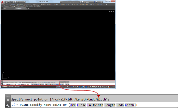 Ein fixiertes Befehlsfenster hat dieselbe Breite wie das Anwendungsfenster. Es wird an einer festen Position oberhalb oder unterhalb des Zeichenbereichs angezeigt.