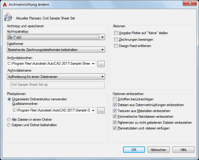 Schließt die Plansatzdatendatei (DST), Dateien für Bezeichnungsblöcke, Dateien für Beschriftungsblöcke und die zugehörigen Zeichnungsvorlagendateien (DWT) in das Archivpaket ein.