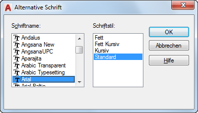 Wenn Sie keine alternative Schrift bestimmen, wird beim Öffnen von Zeichnungen, die nicht aufgefundene Schriften enthalten, ein Dialogfeld angezeigt, in dem Sie jeweils eine Schrift als Ersatz für die fehlenden Schriften festlegen können.