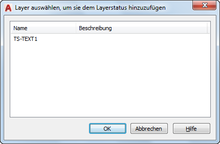 Zeigt den Namen und die Beschreibung der Layer an, die dem Layerstatus nicht hinzugefügt wurden. Wählen Sie den hinzuzufügenden Layer, und klicken Sie auf OK.