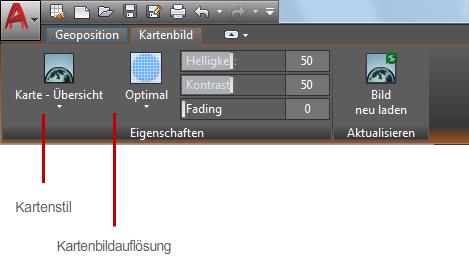 Wenn Sie bei Autodesk A360 angemeldet sind, können Sie die Auflösung von Kartenbildern ändern, die Größe und Opazität anpassen oder auf die neueste, beim Online-Kartendienst verfügbare Version aktualisieren.