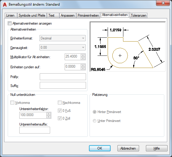 Steuert die Anzeige von Alternativeinheiten in Maßwerten und legt Format sowie Genauigkeit fest.