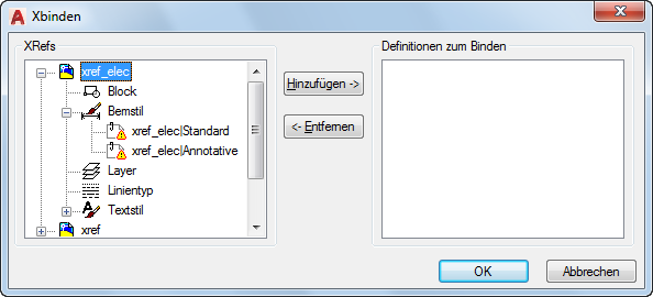Verschiebt die in der XRef-Liste ausgewählten Definitionen benannter Objekte in die Liste Definitionen zum Binden.