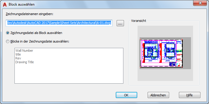 Gibt den Pfad und Namen einer Zeichnungsdatei (DWG-Datei) oder den Namen und Pfad einer Zeichnungsvorlagendaten (DWT-Datei) an, die als Quelle für eine Blockdefinition verwendet werden soll.