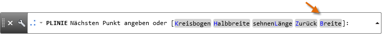 Polylinien können eine konstante Breite oder eine unterschiedliche Anfangs- und Endbreite haben. Wenn Sie den ersten Punkt der Polylinie angegeben haben, können Sie die Option Breite verwenden, um die Breite für alle nachfolgend erstellten Segmente festzulegen. Sie können den Wert für die Breite jederzeit ändern, sogar während Sie neue Segmente erstellen.