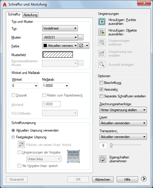 Das Dialogfeld Schraffur und Abstufung hat zwei Registerkarten. Einige Optionen sind auf beiden Registerkarten verfügbar.