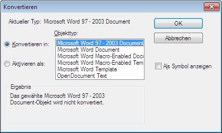 Konvertiert das eingebettete Objekt in den unter Objekttyp angegebenen Typ.