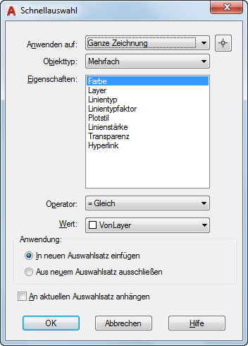 Wenn die Option An aktuellen Auswahlsatz anhängen gewählt ist, werden die Filterkriterien auf die gesamte Zeichnung angewendet.