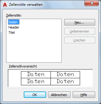 Listet alle im aktuellen Tabellenstil enthaltenen Zellenstile auf. Die Zellenstile Titel, Header und Daten sind immer in einem Tabellenstil enthalten.