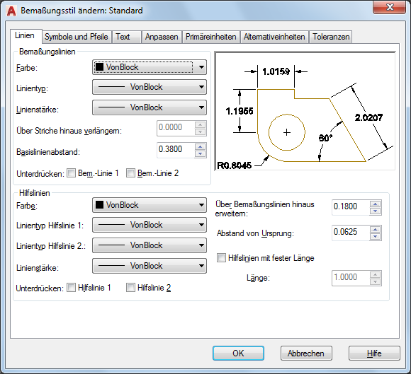 Zur Bestimmung des Formats und der Eigenschaften von Maßlinien, Hilfslinien, Pfeilspitzen und Zentrumsmarken.