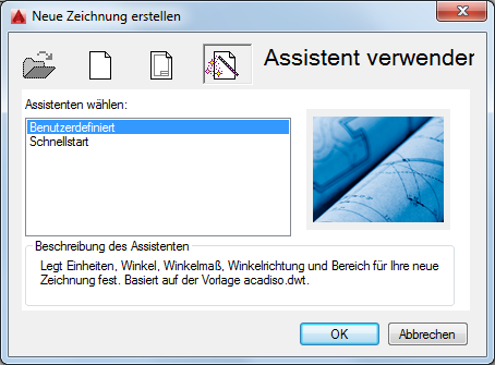 Bietet eine schrittweise Anleitung zur Erstellung einer Zeichnung. Es stehen zwei Assistenten zur Auswahl: der Assistent für Schnellstart und der Assistent Benutzerdefiniert.