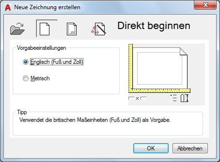 Ist die Schaltfläche Direkt beginnen ausgewählt, wird eine neue Zeichnung erstellt. Es werden entweder englische oder metrische Vorgabeeinstellungen verwendet. Ist die Schaltfläche Vorlage verwenden ausgewählt, wird eine neue Zeichnung unter Verwendung der ausgewählten Zeichnungsvorlage erstellt. Ist die Schaltfläche Assistent verwenden ausgewählt, wird eine neue Zeichnung unter Verwendung der ausgewählten Einstellungen im Assistent für Schnellstart oder im Assistent Benutzerdefiniert erstellt. (Die erste Option, Zeichnung öffnen, steht beim Befehl NEU nicht zur Verfügung. Zum Öffnen einer vorhandenen Zeichnung verwenden Sie den Befehl ÖFFNEN.)