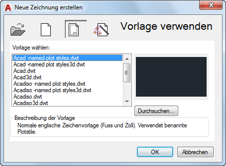 Zeigt eine Liste aller DWT-Dateien an, die sich derzeit im Pfad der Zeichnungsvorlagendateien befinden. Dieser Pfad wird im Dialogfeld Optionen festgelegt. Wählen Sie die Datei aus, die als Grundlage für die neue Zeichnung dienen soll.