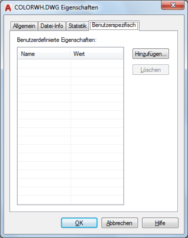 Führt die Namen und die Werte der benutzerspezifischen Eigenschaften in der aktuellen Zeichnung auf.