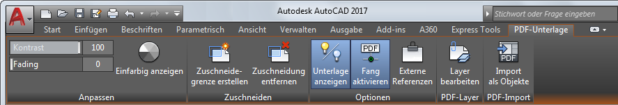 Wenn Sie eine PDF-Unterlage auswählen, wird die kontextabhängige Registerkarte PDF in der Multifunktionsleiste angezeigt.