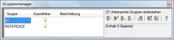 Ist eine Gruppe nicht wählbar, ist das Glühlampensymbol deaktiviert. Bei Auswahl eines einzelnen Gruppenelements wird dann nur dieses Objekt ausgewählt. Wenn die Systemvariable PICKSTYLE auf 0 gesetzt ist, können keine Gruppen ausgewählt werden.