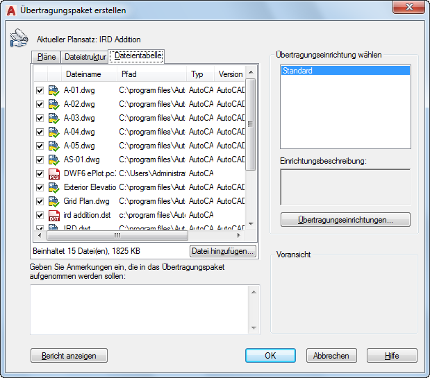 Zeigt Berichtsdaten an, die Bestandteil des Übertragungspakets sind. Dazu gehören alle Übertragungshinweise, die Sie eingegeben haben, sowie alle automatisch erstellten Verteilungshinweise. In den Verteilungshinweisen werden die Schritte beschrieben, die für eine korrekte Funktionsweise des Übertragungspakets durchgeführt werden müssen. Beispiel: Wenn eine Übertragungszeichnung SHX-Schriften enthält, wird angegeben, wohin Sie die Dateien kopieren müssen, damit diese in dem System, auf dem das Übertragungspaket installiert wird, erkannt werden. Wenn Sie eine Textdatei mit Vorgabeanmerkungen erstellt haben, werden diese Anmerkungen ebenfalls in den Bericht einbezogen.