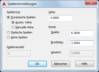 Gibt die Spalten- und Bundstegbreite an. Der Wert für die Bundstegbreite ist fünfmal so hoch wie die vorgegebene Texthöhe.