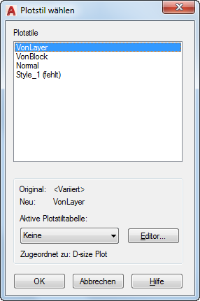 Zeigt die verfügbaren Plotstile an, einschließlich des Standardplotstils NORMAL. Ein Plotstil besteht aus einer Sammlung von Eigenschaften, die beim Plotten angewendet werden.