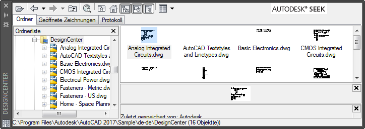 Verwenden Sie die Strukturansicht auf der linken Seite, um die Inhaltsquellen zu durchsuchen und den Inhalt im Inhaltsbereich auf der rechten Seite anzuzeigen. Im Inhaltsbereich können Sie einer Zeichnung oder einer Werkzeugpalette Elemente hinzuzufügen. Für ausgewählte Zeichnungen, Blöcke, Schraffuren oder XRefs wird eine Vorschau oder Beschreibung angezeigt.