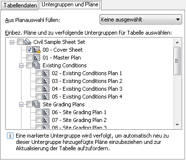 Zeigt Optionen zur Steuerung der Planauswahl an, die als aktuelles Planinhaltsverzeichnis dargestellt ist.