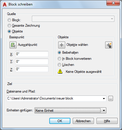 Wählt Objekte aus, um sie als Datei zu speichern. Legen Sie einen Basispunkt fest, und wählen Sie unten Objekte aus.