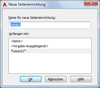 Legt einen Namen für die neue Seiteneinrichtung fest und gibt an, welche Seiteneinrichtung als Ausgangspunkt verwendet werden soll.