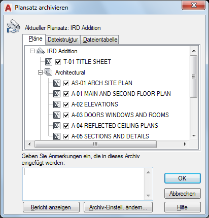 Enthält eine Liste der Pläne, die dem Archivpaket hinzugefügt werden. Die Reihenfolge entspricht der Reihenfolge der Pläne oder der Organisation des untergeordneten Satzes. Dazu muss ein Plansatz im Manager für Planungsunterlagen geöffnet sein. Sie können entweder die Archiv-Option aus dem Kontextmenü wählen, das Sie durch Rechtsklick auf den obersten Plansatzknoten öffnen, oder in der Befehlszeile ARCHIV eingeben.