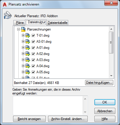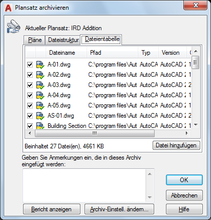 Listet die in das Archivpaket aufzunehmenden Dateien im Tabellenformat auf. Vorgabemäßig werden alle Dateien, die mit der aktuellen Zeichnung verknüpft sind (wie z. B. zugehörige XRefs, Plotstile und Schriften), aufgelistet. Sie können dem Archivpaket Dateien hinzufügen oder Dateien daraus entfernen. Zugehörige Dateien, auf die durch URLs verwiesen wird, werden nicht in das Archivpaket eingeschlossen.