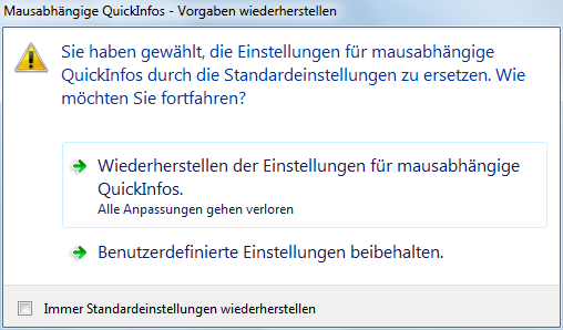 Wenn ein Objekttyp ausgewählt ist, werden die Eigenschaften für diesen Objekttyp in einer mausabhängigen QuickInfo angezeigt, sobald der Mauszeiger über ein Objekt des entsprechenden Typs geführt wird. Heben Sie die Auswahl eines Objekttyps auf, wenn dieser Objekttyp keine mausabhängigen QuickInfos unterstützen soll.