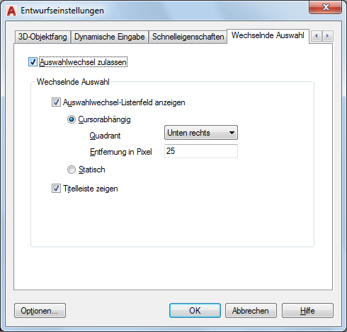 Steuert, ob die Funktion zum Wechseln der Auswahl aktiviert ist. SELECTIONCYCLING (Systemvariable)