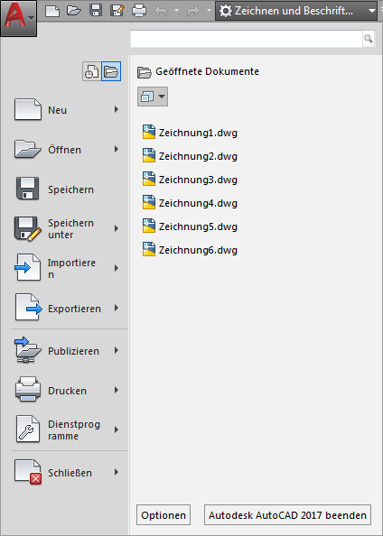 Geöffnete Dokumenten werden in der Liste Geöffnete Dokumente mit der zuletzt geöffneten Datei an erster Stelle angezeigt. Wählen Sie einen Dokumentnamen aus, um ihn zu aktivieren.